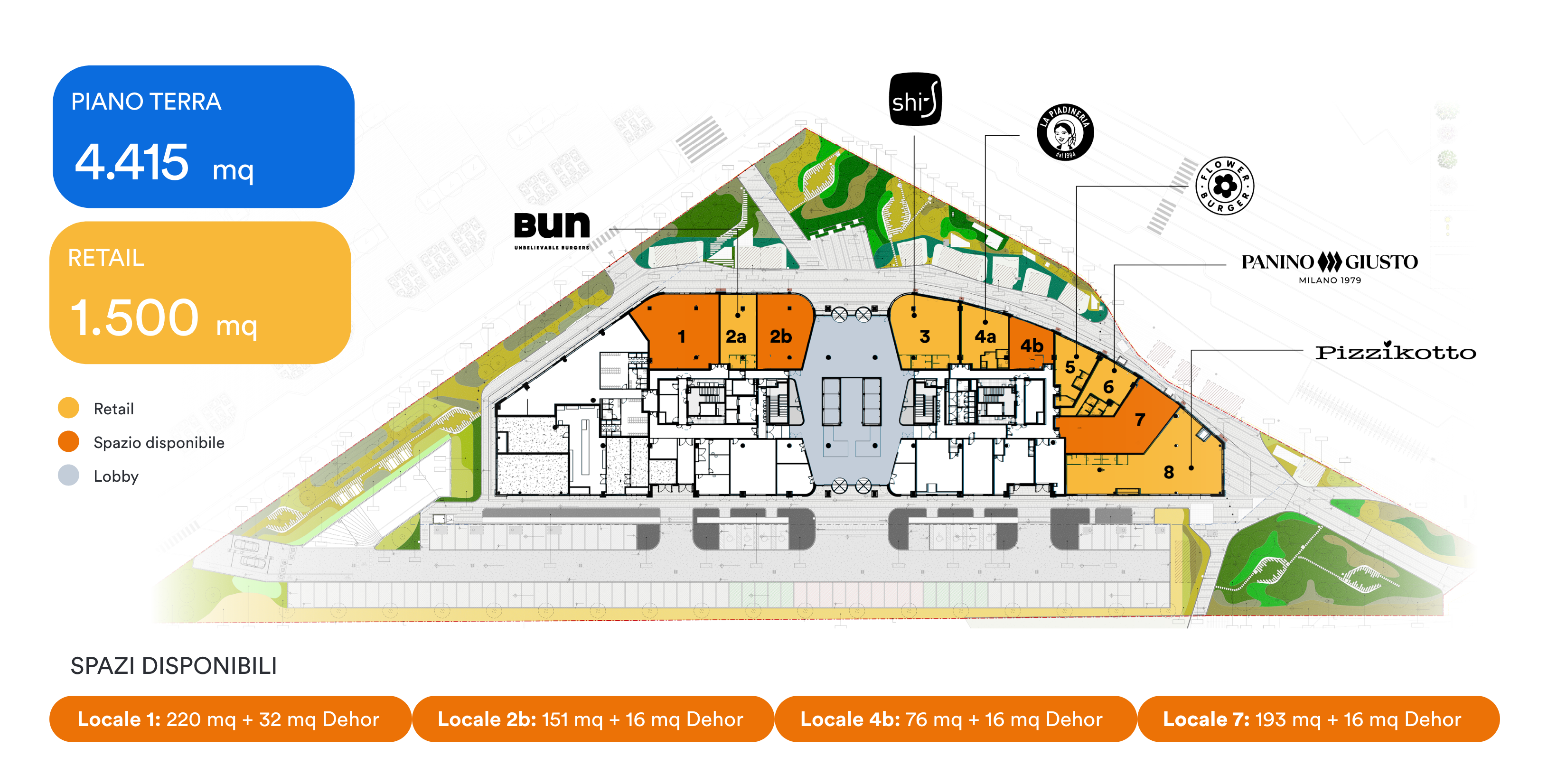 I 7 locali dello Spark Food District, con metrature dagli 80 ai 300 mq, con i loro caratteristici dehor esterni si integrano con le funzioni pubbliche e la vita in movimento del quartiere.